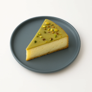 چیز کیک خامهای و لطیف با طعم اصیل پسته، پایهای ترد از بیسکوییت و رویهای تزیینشده با پسته، انتخابی بینظیر برای دسر و شیرین کردن لحظات.