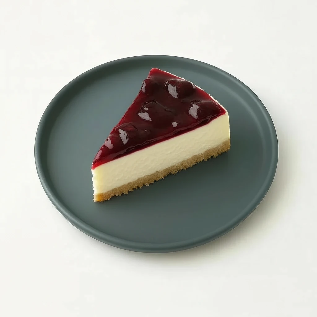 چیز کیک کلاسیک با طعم شیرین تمشک، با لایهای ترد از بیسکوییت در پایه و رویهای لطیف از کرم پنیری به همراه تکههای تمشک.